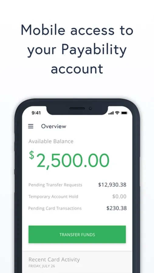 Introducing the free Payability Mobile app! Use the app to check your Payability available balance, review your recent seller card transactions, and transfers funds - all on your schedule, at your convenience. Simply log in using your Payability account email and password to get started.