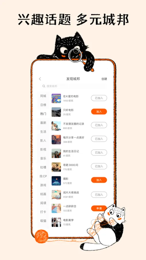 通过观影口味结交志趣相投的朋友,没有熟人社交的压力,也没有营销和约约约的困扰。把不愿意发朋友圈的心情分享给懂你的人。还可以根据兴趣和所在的城市,就地构建城邦,一起分享生活点滴。