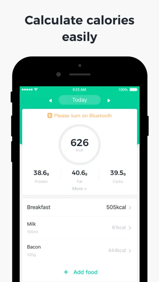 • On the home page, select Add Food, connect the scale to the food and measure it. After the measurement, calculate the actual calories.