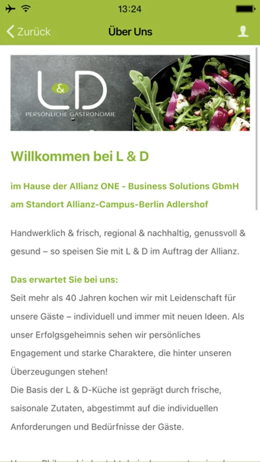 Die L & D App bietet Ihnen umfassende Informationen zu Ihrem L & D Restaurant Adlershof bei der Allianz Berlin. Sie erfahren mit wenigen Klicks alles über das Speisenangebot, aktuelle Aktionen und vieles mehr. Zudem können Sie private Bestellungen zu Geburtstagen, Jubiläen oder Teammeetings auslösen. Wir freuen uns über Ihren Besuch