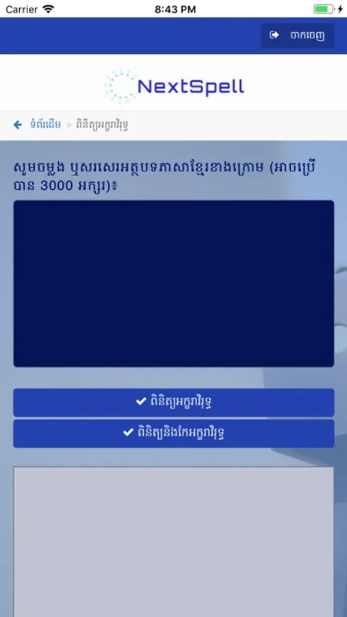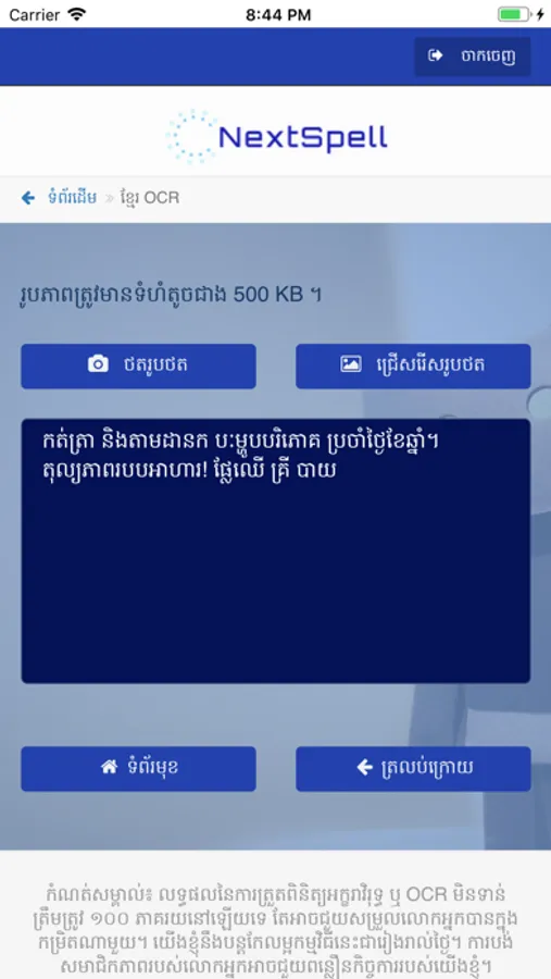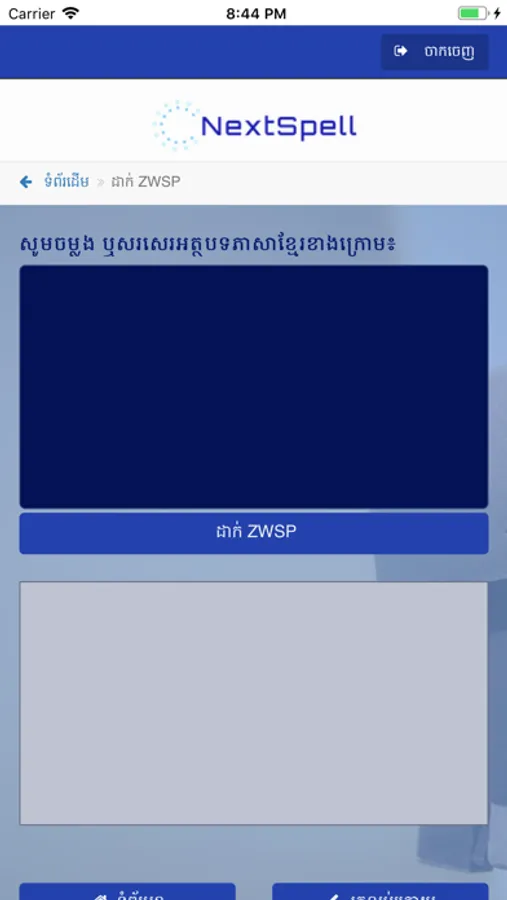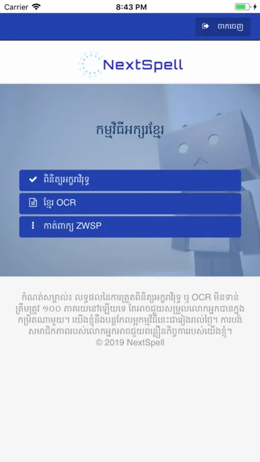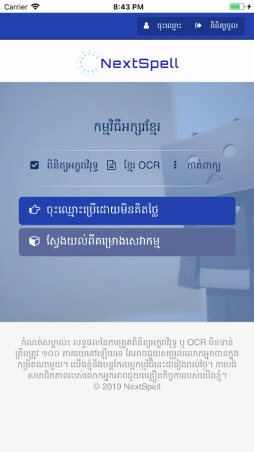 NextSpell is used to check Khmer spelling, extracts Khmer text from images (OCR), and read Khmer from the text. It has the camera function that can take the photo and convert it to Khmer easily. It also has the function to split Khmer words (ZWSP).