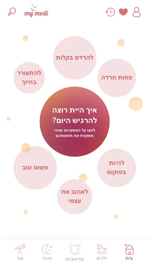 My Medi היא האפליקציה הראשונה למדיטציות מודרכות בעברית שמביאה לכם עשרות מדיטציות בעברית שיעזרו לכם להתמודד עם חרדות ומתחים, יעזרו לכם לישון טוב יותר ולהיות מפוקסים על המטרות שלכם.