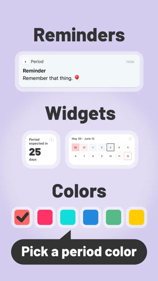 Add widgets to your Home screen to see when your period is due, get reminders, see a 2-week calendar, or just know how many days you are into your cycle.