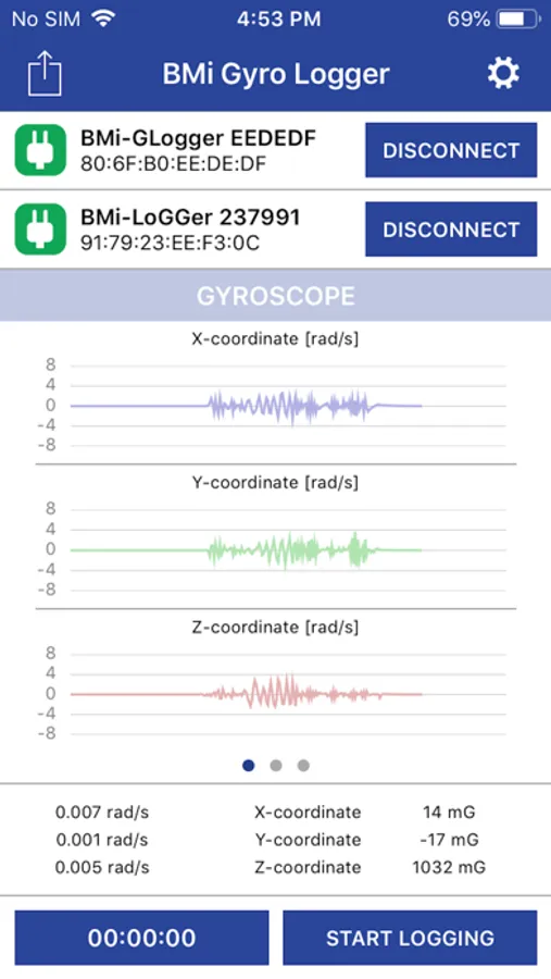 It is the best way to log the rotation and acceleration data from the gyroscope and 3D accelerometer that is integrated into BMi Gyro logger. The format of logged data is CSV file and it can be shared via email, Dropbox, google drive, etc. The Gyro configured for 16g range with sampling 208Hz frequency.