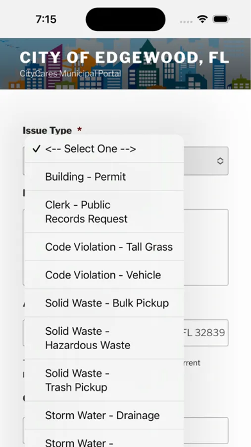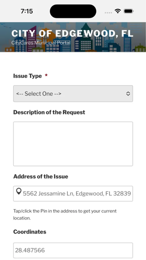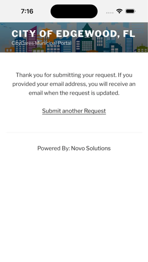 The CityCares app provides an easy way for citizens to submit requests to their local government. Examples include: Road or Sidewalk repair, Traffic Lights out, etc. To use the app, the municipality must have a subscription to the Novo Solutions Citizen Request Management system. Each municipality using the system decides what types of requests can be handled through the application.