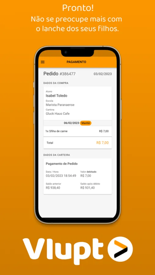 É possível escolher a escola e a cantina que seu filho frequenta, ver o cardápio disponível e realizar compras com facilidade. Além disso, os responsáveis podem acompanhar o histórico de compras e o saldo de créditos de seus filhos, garantindo que eles sempre tenham lanches disponíveis na cantina. Com a Vlupt, os pais podem ter tranquilidade no momento de escolher o que seu filho vai comer na escola, e os filhos podem desfrutar de refeições saudáveis e variadas na cantina.