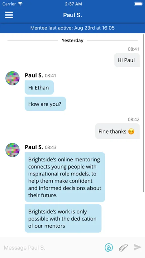 Brightside connects trained mentors with young people who are exploring options for their future. Using this app, volunteer mentors from all professions share their knowledge and experience with young people in order to help them make informed decisions about their future.