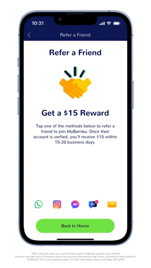 -Refer a friend Program: Offer valid only when your referred friend opens MyBambu account and is verified. Rewards may take up to 15 business days to be processed (Monday through Friday, excluding US bank holidays). *Additional Terms and conditions apply, please visit: https://bit.ly/RaF