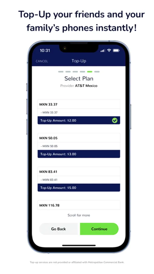 -Add Money, Bill Pay, Gift Cards, International Money Transfers, International Bill Pay, and Top-up, services are not provided or affiliated with Metropolitan Commercial Bank.