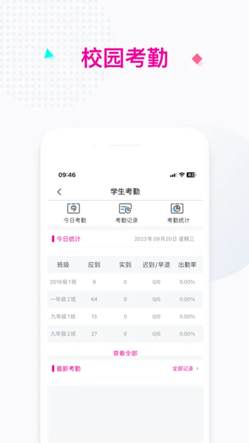 【学生考勤管理】提供今日考勤管理,考勤记录管理、考勤统计(按班级和学生),方便学校管理者和老师及时了解每班学生考勤情况;