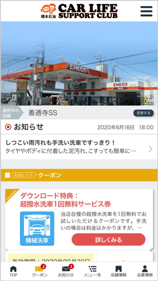 当社の公式アプリ「橋本石油(株)カーライフサポートクラブ」ではアプリで簡単に洗車・コーティングなどのご予約や愛車のメンテナンス管理が可能の他、当店で利用いただけるお得なクーポンや各種メニューの割引情報を配信しております。