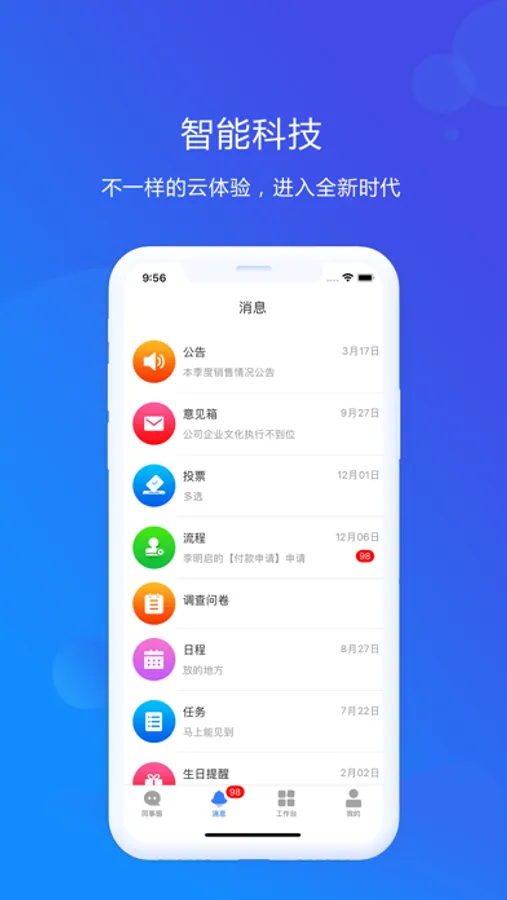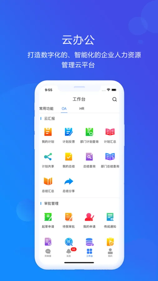 云办公具体有个人办公、任务管理、公告管理、投票管理、意见箱、审批流转等功能模块。