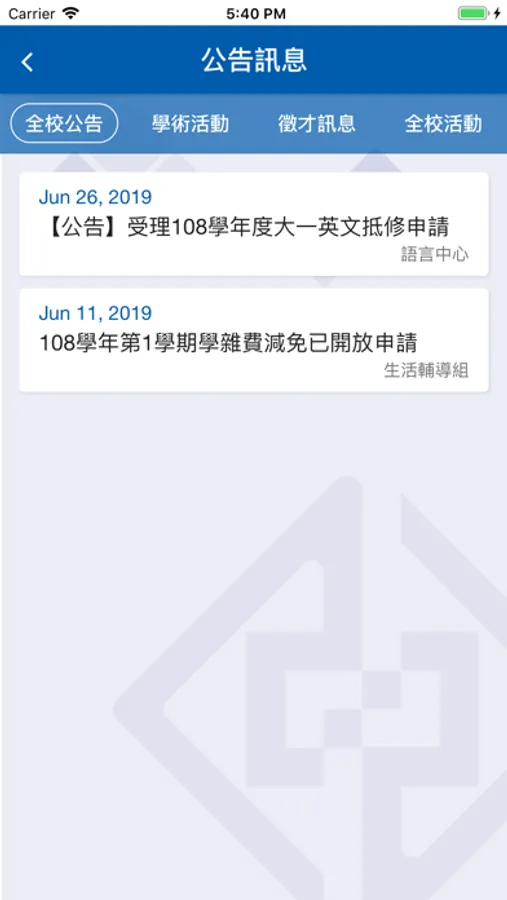 1.公告訊息:查看各項校園新聞、校園公告及個人訊息推播