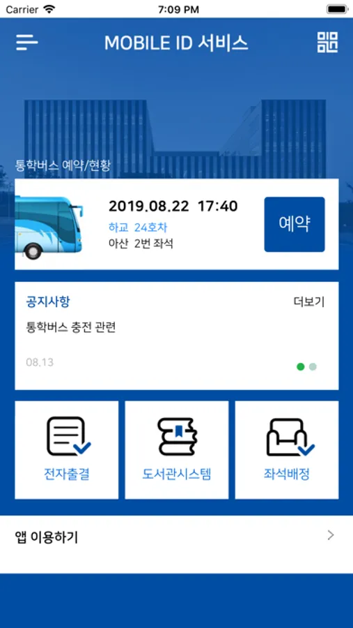- 도서관 게이트 출입, 유/무인 대출 및 반납, 열람실 무인좌석 발급 키오스크에서 모바일학생증(QR/NFC)으로 편리하게 이용