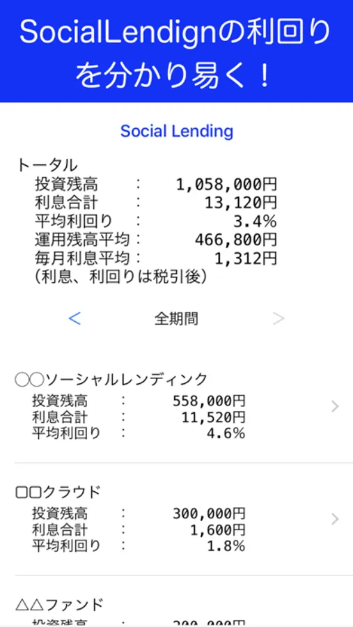 Do you understand social lending, crowdfunding, and actual yields? You can calculate and manage the yield for each period by inputting the deposit / withdrawal amount.
