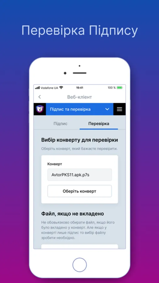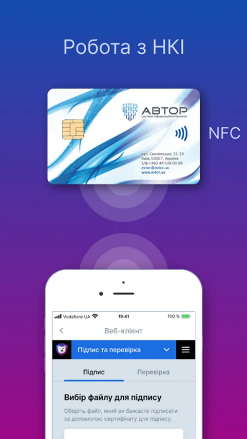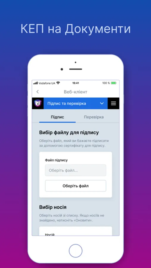 Software: Pfx(PKCS#12), JKS (Java Key Store), .DAT(IIT), .ZS2(Accredited Certification Authority “Ukraine”)