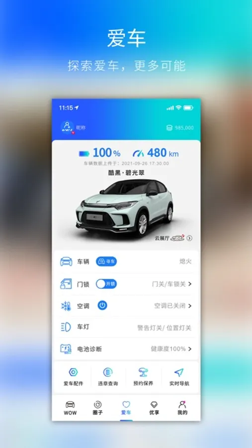 *爱车情况:记录车主绑定的车辆信息状态,包括了充电状态、车身颜色、剩余电量、可续航里程、实时导航、爱车配件、360看车、里程信息、违章查询、预约保养、一键救援等功能,爱车状况一手掌握。