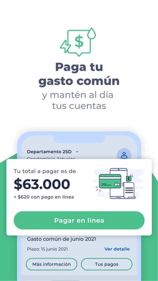 - Revisar el estado de cuenta y pagar en línea tus gastos comunes.