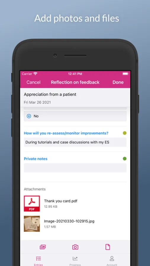 Add any number of attachments to your entries. You can add photos from your device, take a picture from within the app, or attach any other type of file. You can also view attachments right from the app.