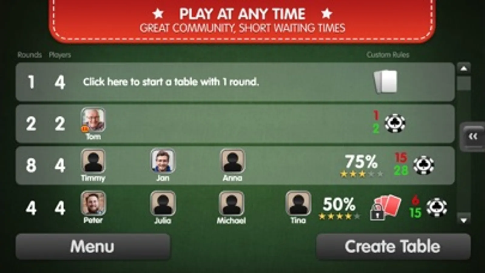 Whether you are a hardcore fan or a casual player, with us, you will always find an opponent at eye level. The joy of playing cards is our priority, and we invite you over to our card tables.