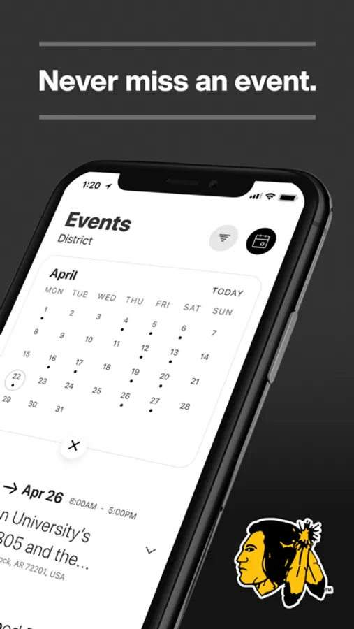 The event section shows a list of events throughout the district. Users can add an event to your calendar to share the event with friends and family with one tap.