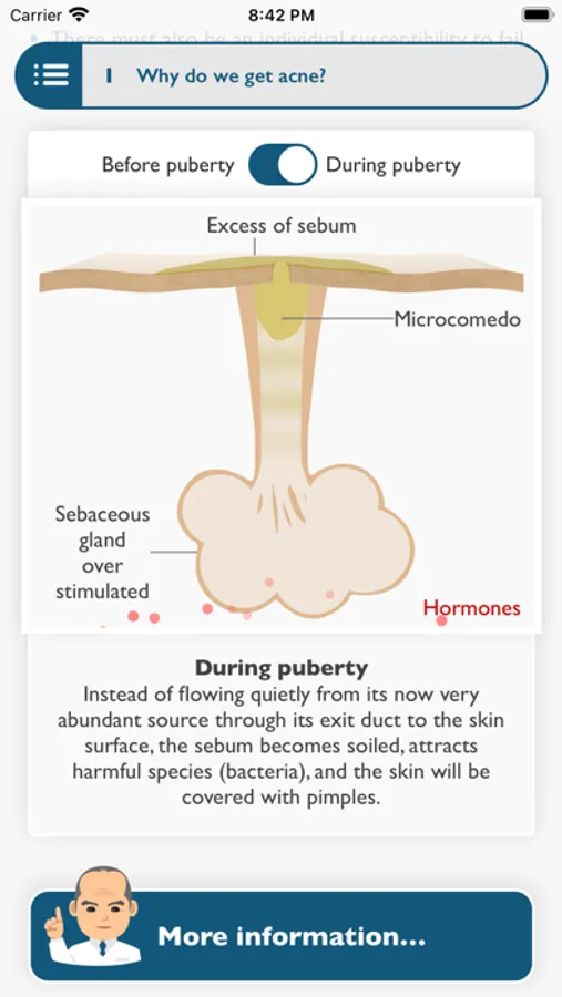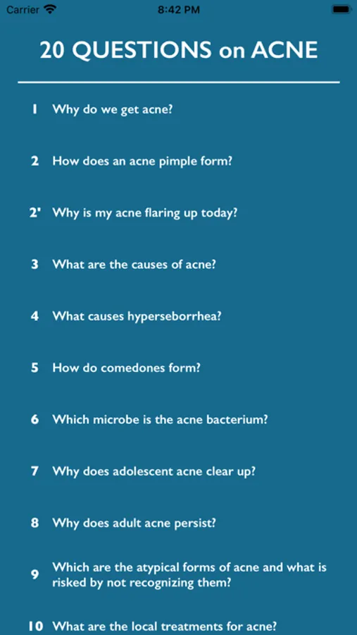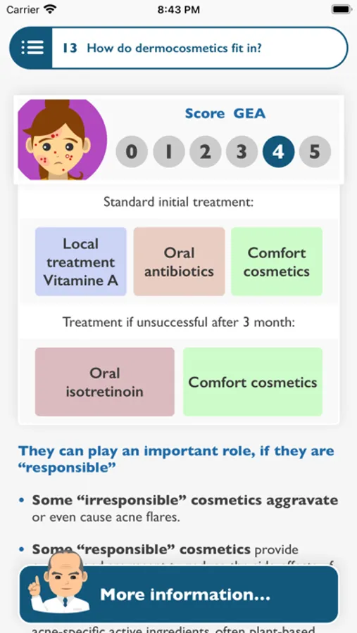 The answers in this application have been drawn up on the basis of the most recent findings in the field of acne and are explained in layman's terms.