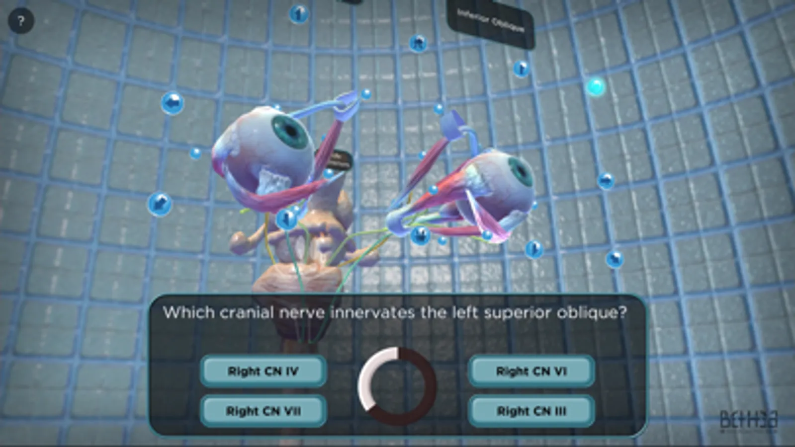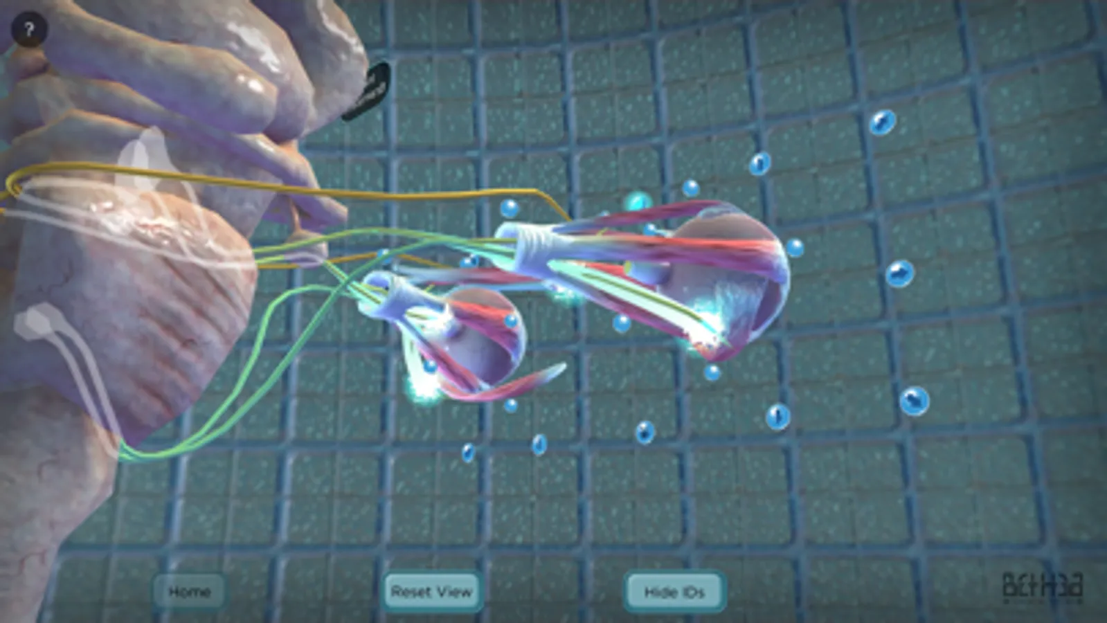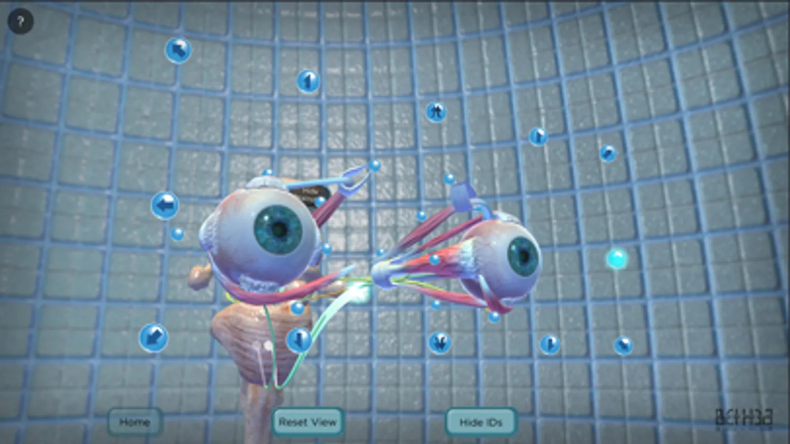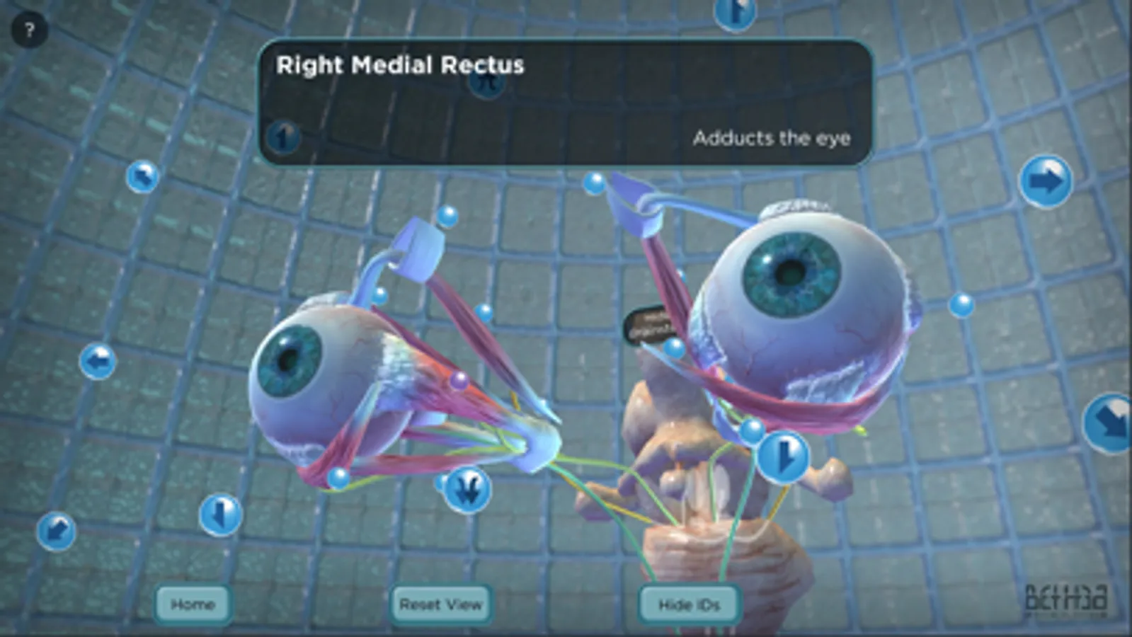 Explore the muscles and nerves that control our voluntary eye movements with this interactive educational 3D module. The human eye can look in every direction with the combined actions of six long, flat muscles: the superior oblique, inferior oblique, and four recti muscles. The Extraocular Muscles app identifies relevant anatomy and helps learners trace muscle activity from the cranial nerve nuclei to the resultant axial rotation. This module includes a timed quiz mode with randomized, thought-provoking questions relating to the anatomy and function of these muscles.
