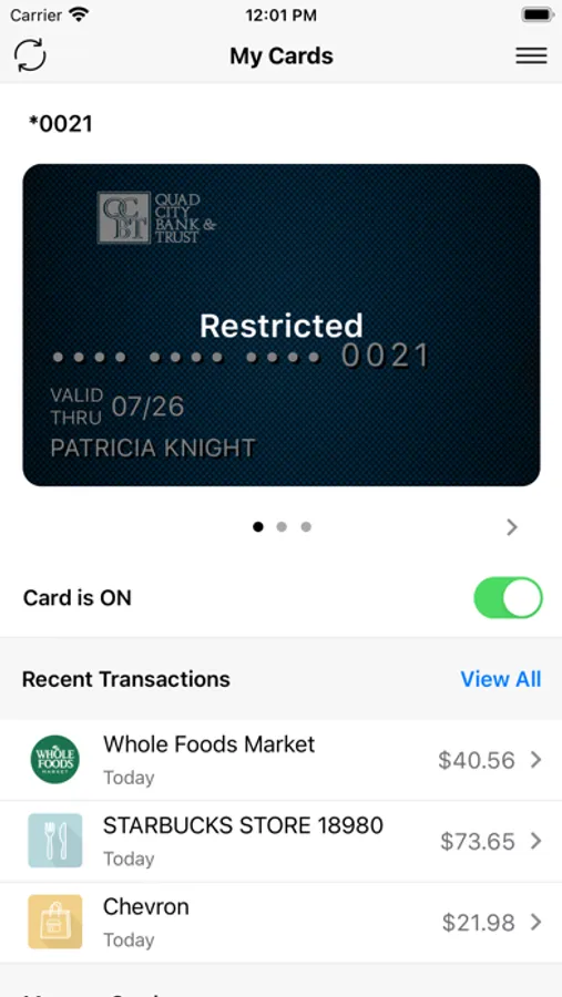 Quad City Bank protects your debit cards by sending transaction alerts and enabling you to define when, where and how your cards are used. Download to your smartphone, then set your preferences to monitor and manage your cards.