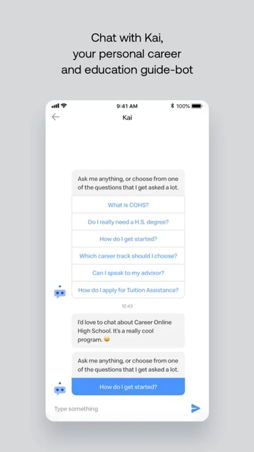 Chat with your personal guide-bot, Kai, who can help answer your questions and connect you with an advisor.