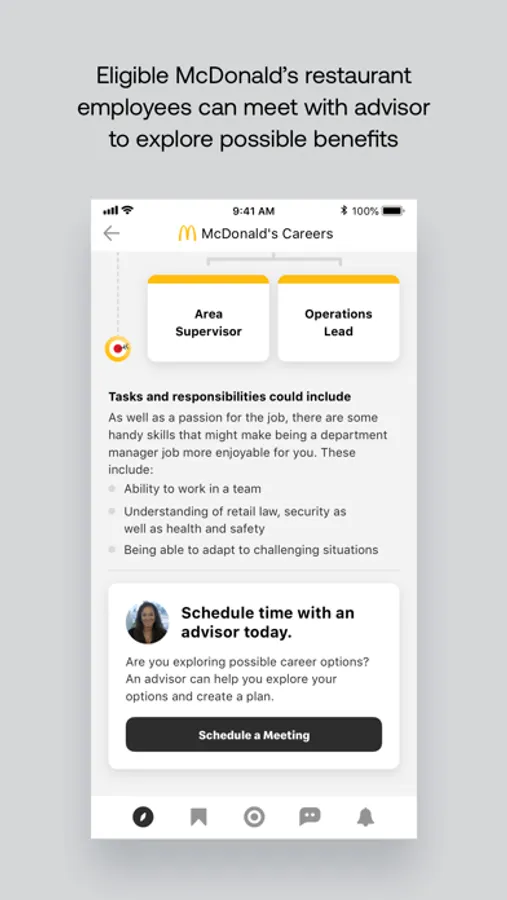 Eligible McDonald’s restaurant employees can meet with an advisor to clarify goals, learn more about the Archways to Opportunity, and create a plan.