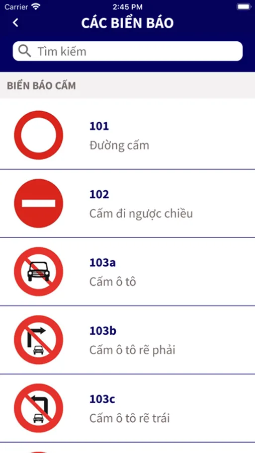 • Danh sách toàn bộ biển báo xuất hiện trong 600 câu hỏi của đề thi giúp bạn tham khảo nhanh các biển báo trong trường hợp cần thiết.