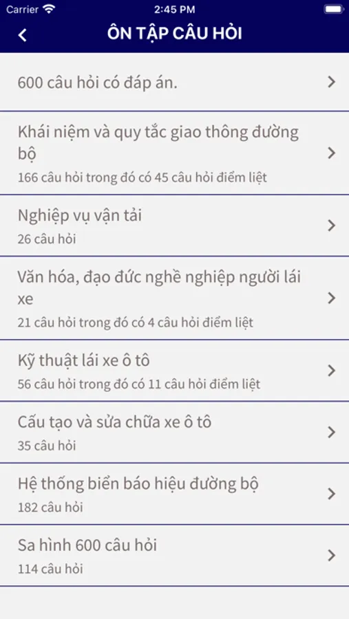 • Danh sách đề thi bao trọn toàn bộ nội dung của 450 câu hỏi và 600 câu hỏi năm 2020(số lượng câu hỏi tùy theo bằng lái).