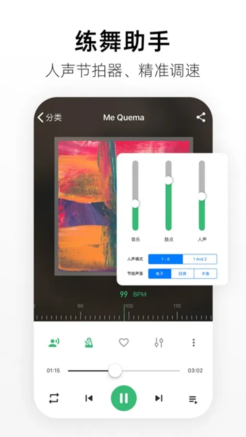 支持人声模式和普通模式两种节拍器,支持BPM精准调速。