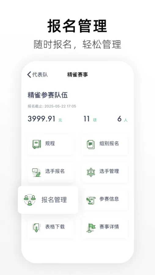 为参赛代表队提供按组别报名,按选手报名两种报名方式。提供已报名管理功能。提供组别表,报名表,赛程表,成绩表等表格下载。需邮寄资料的参赛代表队可填写邮寄地址给主办方。参赛代表队可在自己账号添加协作人员,支持多领队共同协作报名。