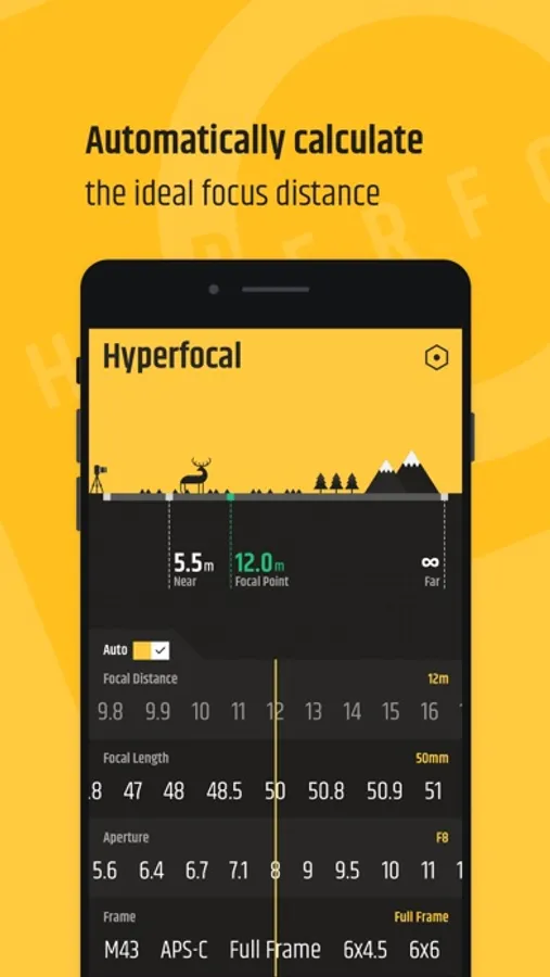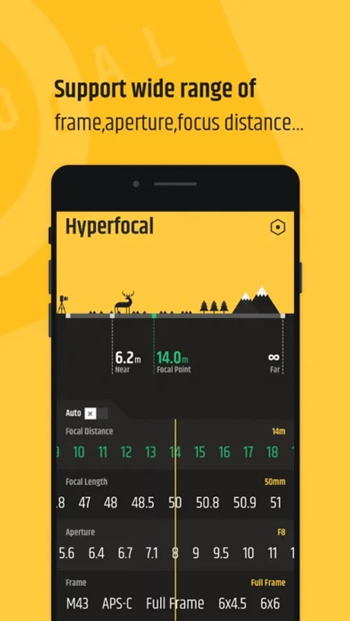 1. After manually setting the frame, aperture and lens focal length, it can automatically determine the focus distance of the hyperfocal distance, and identify the depth of field near limit and far limit (infinity).