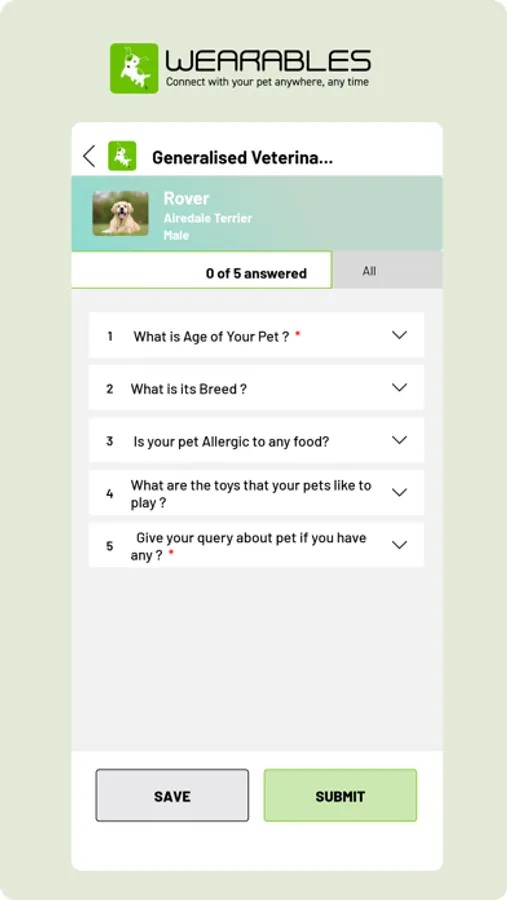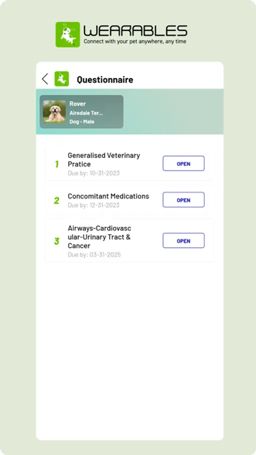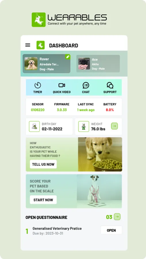 The Wearables Clinical Trial (WCT) App allows pet owners to participate in studies with their pet. It can be used to set up a wearable sensor, upload photos or videos and answer questionnaires related to the study their pet is enrolled in.