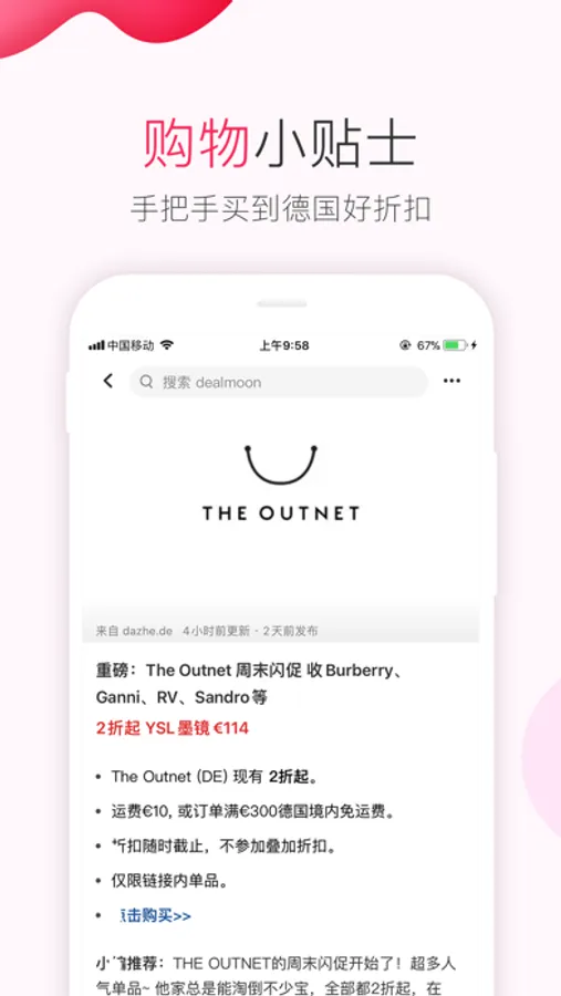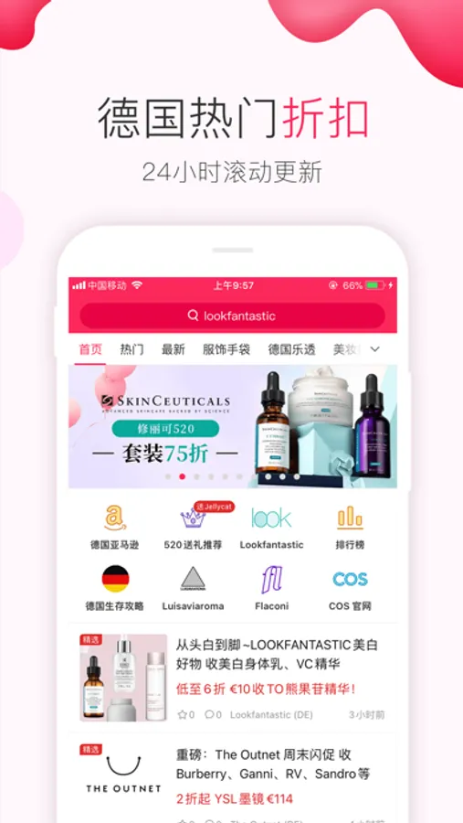 德国商家最新最热的折扣信息,24/7滚动更新。德国购物优惠资讯:女装、男装、鞋包、美妆、护肤、家居、母婴、零食、数码,超值优惠一网打尽!德国省钱快报是找全球好物,分享优质生活的购物内容平台,是德国生活购物、海淘购物必备神器。集合了各大品牌商家折扣:大牌化妆品、护肤品等美妆折扣,包包鞋子潮服等时尚类折扣,美食零食、家居厨卫、电器、电子电脑、汽车旅游、影视演出等生活类折扣和优惠信息。德国省钱快报提供华人最爱的购物生活信息分享:美妆护肤和时尚购物心得和晒货、德国最受欢迎美食零食推荐,旅游、移民、运动保健、母婴护理、教育、汽车和出行、数码、电子电脑和海淘等各类指南干货文章。关于德国生活衣食住行用、方方面面的实用信息都能在这里找到。