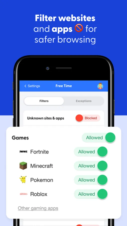 Our web filter lets you select which websites your child can access on their devices. You can allow or block specific sites — or even whole categories like streaming services, online gaming, sexual content, and more.