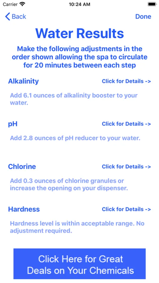 No more guessing about which and how much chemicals to add to balance your water. Simply set the values in Spa Star from your favourite test strips (we recommend Aqua-Test strips but any strip will work) and let Spa Star calculate your corrections for you.