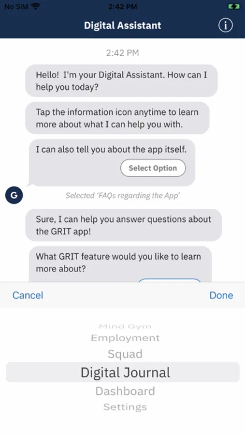 • Your Coping Score provides proactive intervention in the moment. Your Coping Score will be created by models using input from Mind Gym assessments, conditional screenings, and social media if you choose to include. Your Coping Score is monitored for changes and provides you with proactive intervention activities using other components of the app like engaging the Digital Assistant, your Squad, or the option to talk with a live person.
