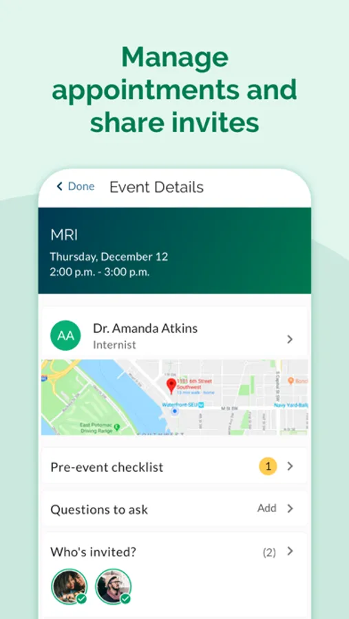 • Use the health calendar to manage health appointments, get reminders, and invite loved ones to attend. Plus, add upcoming surgeries to stay organized and track progress from preparation through recovery.