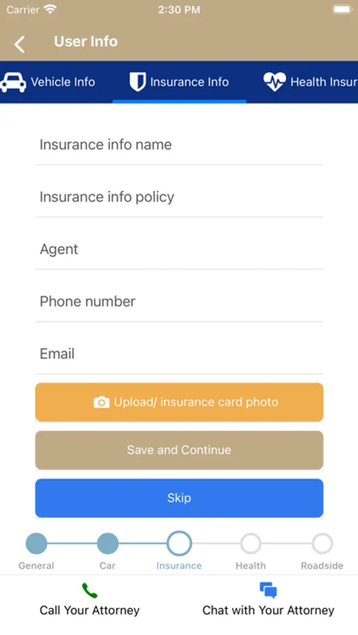The core feature of our App is the ability to live chat with your attorney office to ask questions, get updates, and more. Our system allows you access into your favorite firm to store all drivers information for when you need it most. Store your drivers license, car insurance, roadside assistance, and more. Involved in an accident, have the ability to report ll new car accidents directly though our mobile app and instantly notify our legal team of what happened. Next chat with us for the next steps.