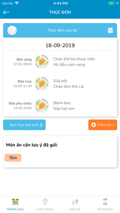 2. Thực đơn: Giúp phụ huynh cập nhật được thực đơn và lượng calo trong từng bữa ăn. Trợ lý Bun sẽ thông báo cho phụ huynh và giáo viên nếu có món ăn trong thực đơn không phù hợp với con.