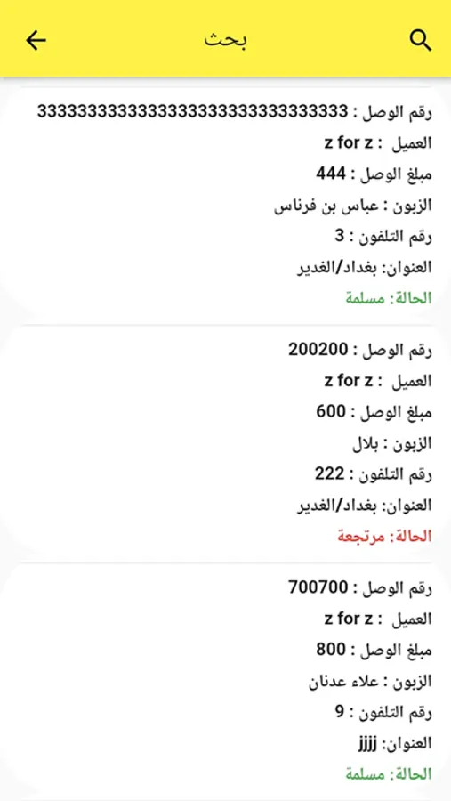 واجهة عرض لكل طلبات التوصيل السابقة مع بيان الحالة