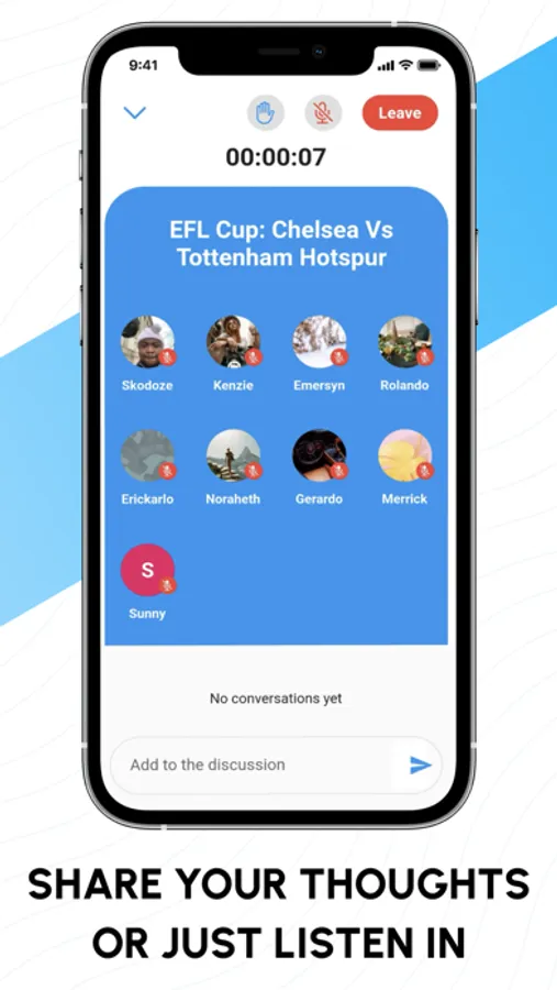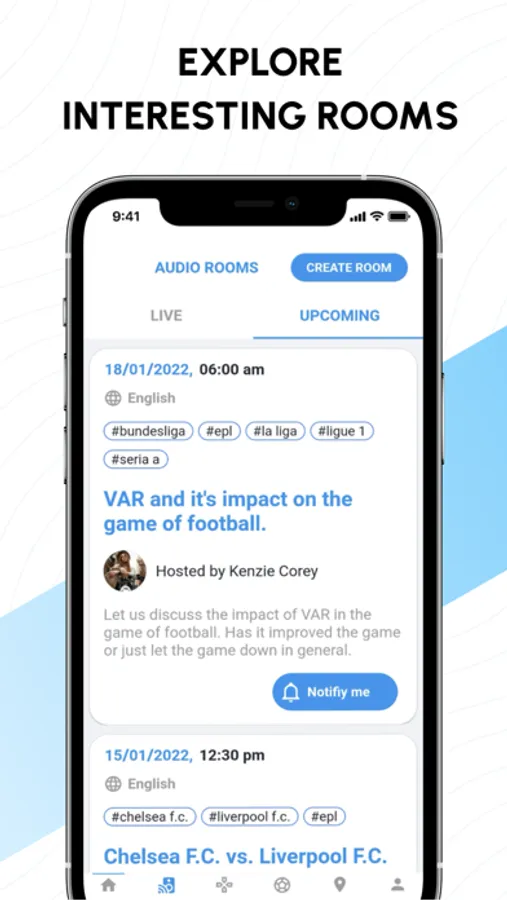 Join interesting audio rooms and listen or share your thoughts on your favorite teams, matches, game events, refereeing decisions, players, managers and so much more.