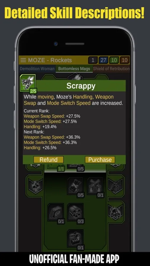 - See detailed descriptions of skills and their respective ranked stats.