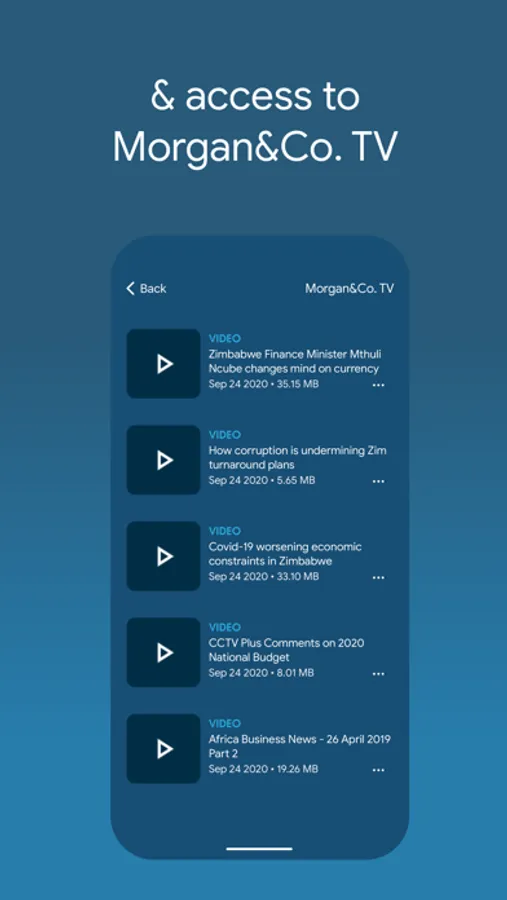 The Morgan & Co Research App simplifies the investment space for you by offering in-depth, cutting-edge research content in Zimbabwe’s investment landscape. The Research App has a unique Investor Relations (IR) function that provides access to the management teams of all listed counters on the Zimbabwe Stock Exchange (ZSE) and Financial Securities Exchange (FINSEC).