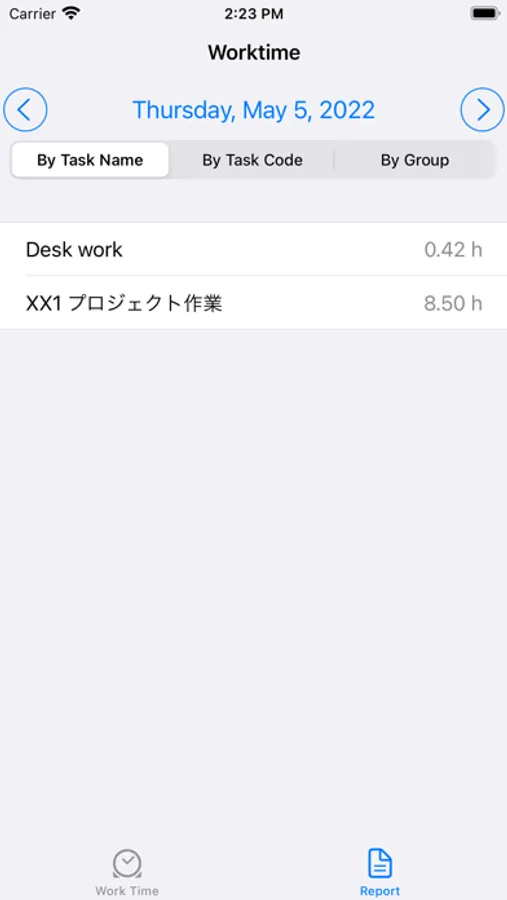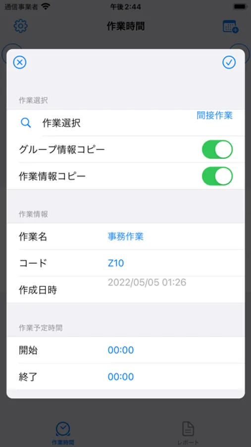 作業時間の実績は、作業別、作業コード別、グループ別で集計して確認できます。