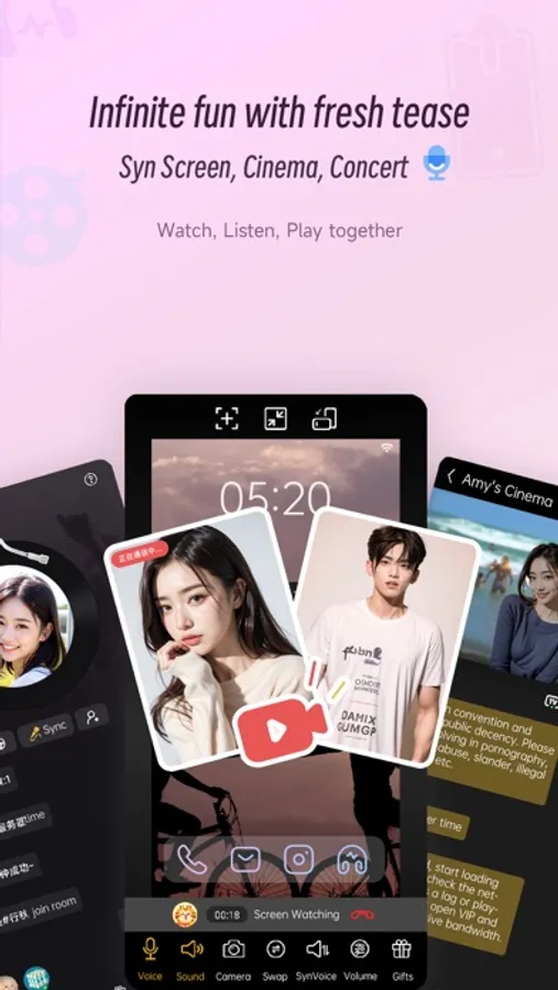 The 'SynchFun APP' is a must-have for long-distance couples in a syn-screen social setting, featuring enjoyable and interesting live voice chats. It adds more fun to the 5G era, providing exciting new ways to connect. Give it a try!