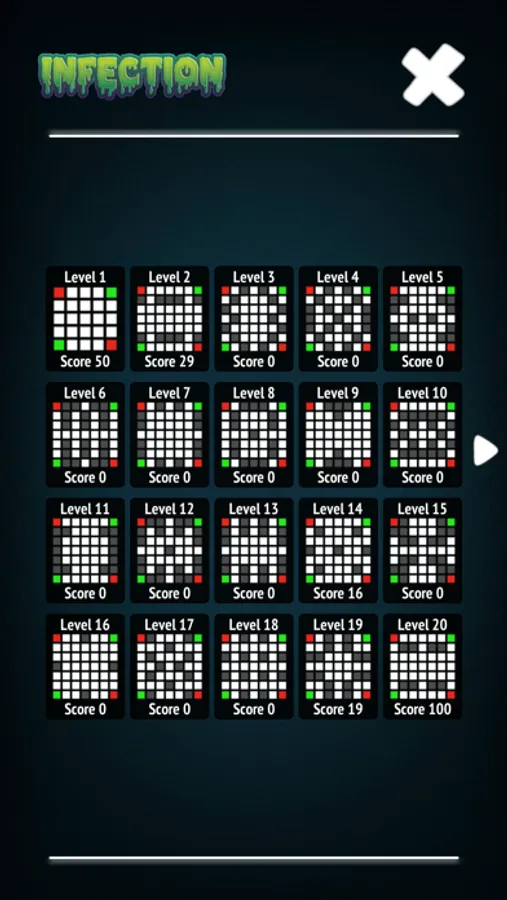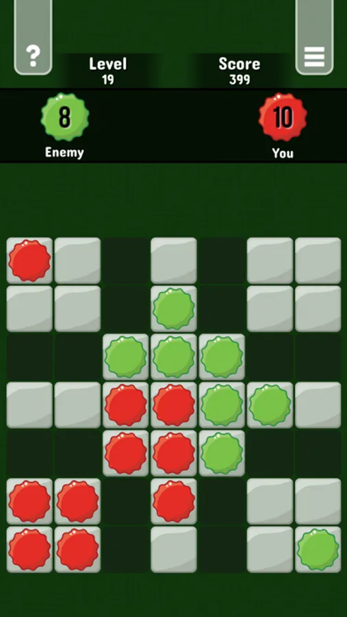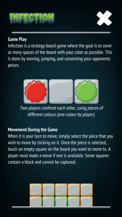 Infection is an abstract strategy board game that involves play by two parties on a seven-by-seven square grid. The object of the game is to make your pieces constitute a majority of the pieces on the board at the end of the game, by converting as many of your opponent's pieces as possible.
